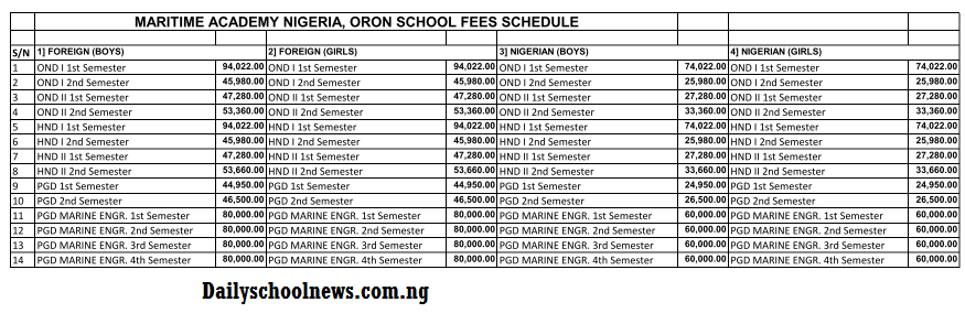 Maritime Academy Nigeria Oron School Fees